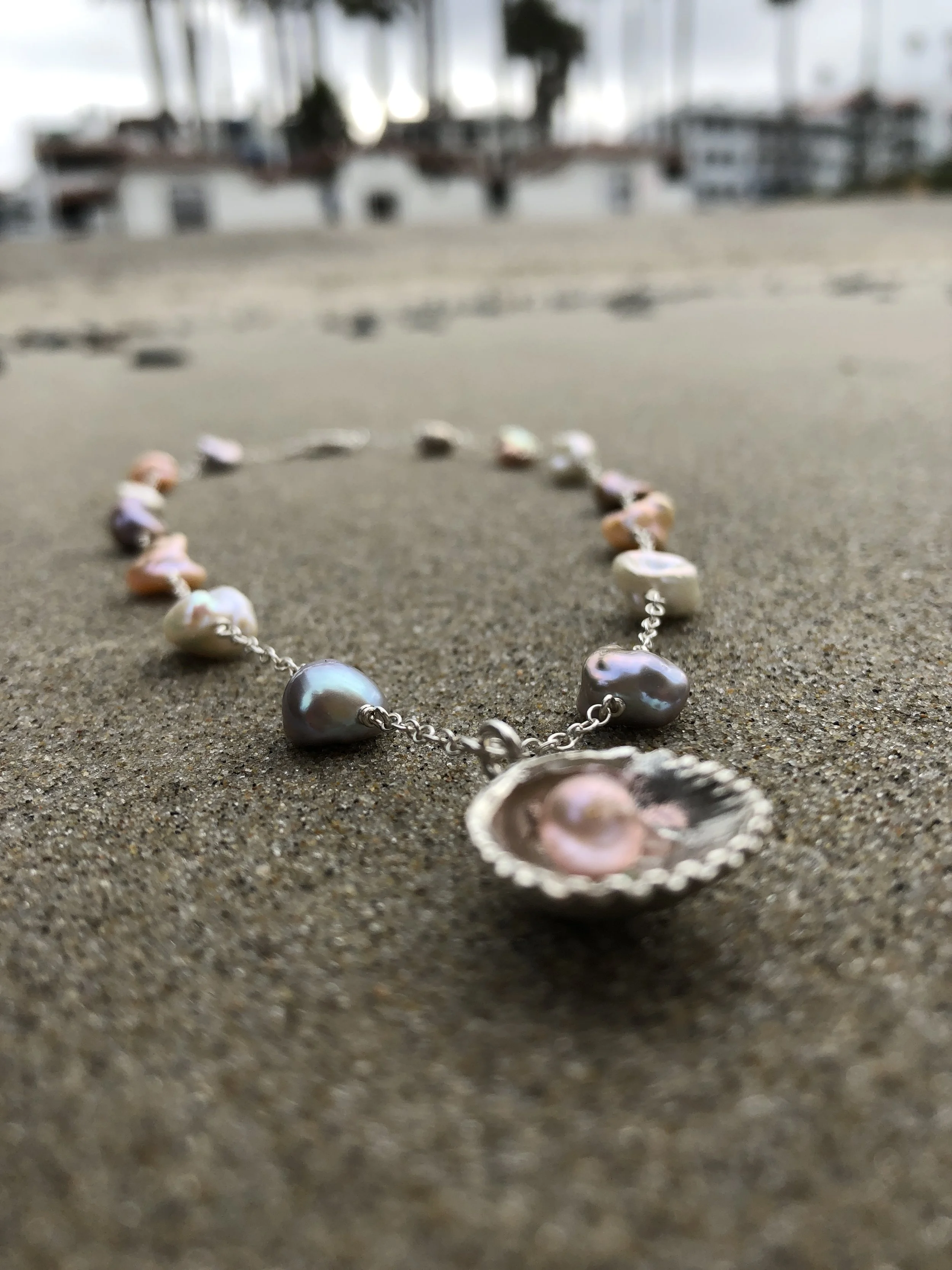 Comes with fourteen mixed color Keshi pearls and a sterling silver shell with pearl.